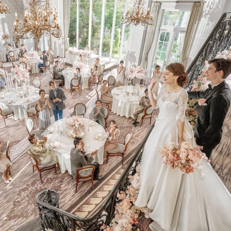 【金曜限定VIP枠】憧れの大階段から降り立つ瞬間は、ゲストの視線と祝福を独占するドラマチックなワンシーン♪どこを切り取っても絵になる貸切邸宅の見学や、贅沢フレンチ試食でワンランク上のウエディングを体感